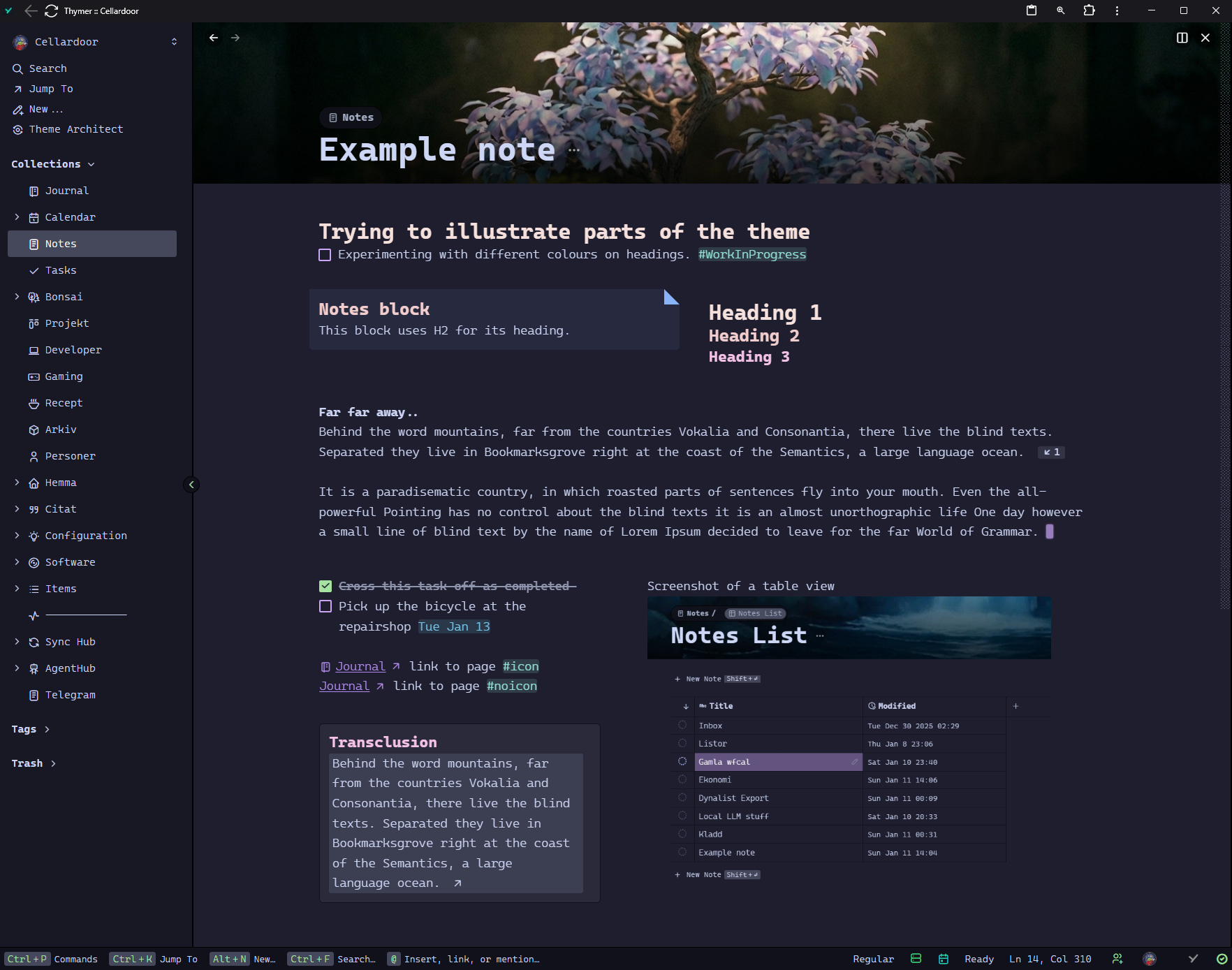 Here [in Thymer] you probably won’t find a new way to structure your thinking. In some ways, Thymer is far less complex than Tana. It leans on Workspace > Collection > Page > Block for structure. In Tana, everything is a node. In Thymer, blocks live on pages that live within collections that live within workspaces. It’s “folder-based” / tree-oriented thinking in that sense. You’ll lose the fluidity of supertags and just tagging a node and getting all your fields, etc. You won’t be able to just write stuff wherever you want. There’s still a day page (but only a day page, no weeks or month structure to interact with). And you’ll generally need to be more thoughtful about “This is a thing that belongs in this collection” when you’re writing, though working strictly from the day page is still an option.